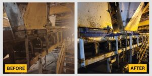 The MaxZone Plus® system was installed to direct material to the belt’s center, ensuring even distribution and reducing spillage. Its modular design allows for easy installation and maintenance. The Skirtboard system, with high-abrasion liners, protects against wear, while the XN Liners guide material smoothly onto the belt, reducing misalignment. Additionally, B Plus skirt rubber was used for its durability and effectiveness, further enhancing the system’s performance. Finally, a thorough cleanup of the plant, addressing the accumulated spillage and improving overall safety and cleanliness, was conducted.